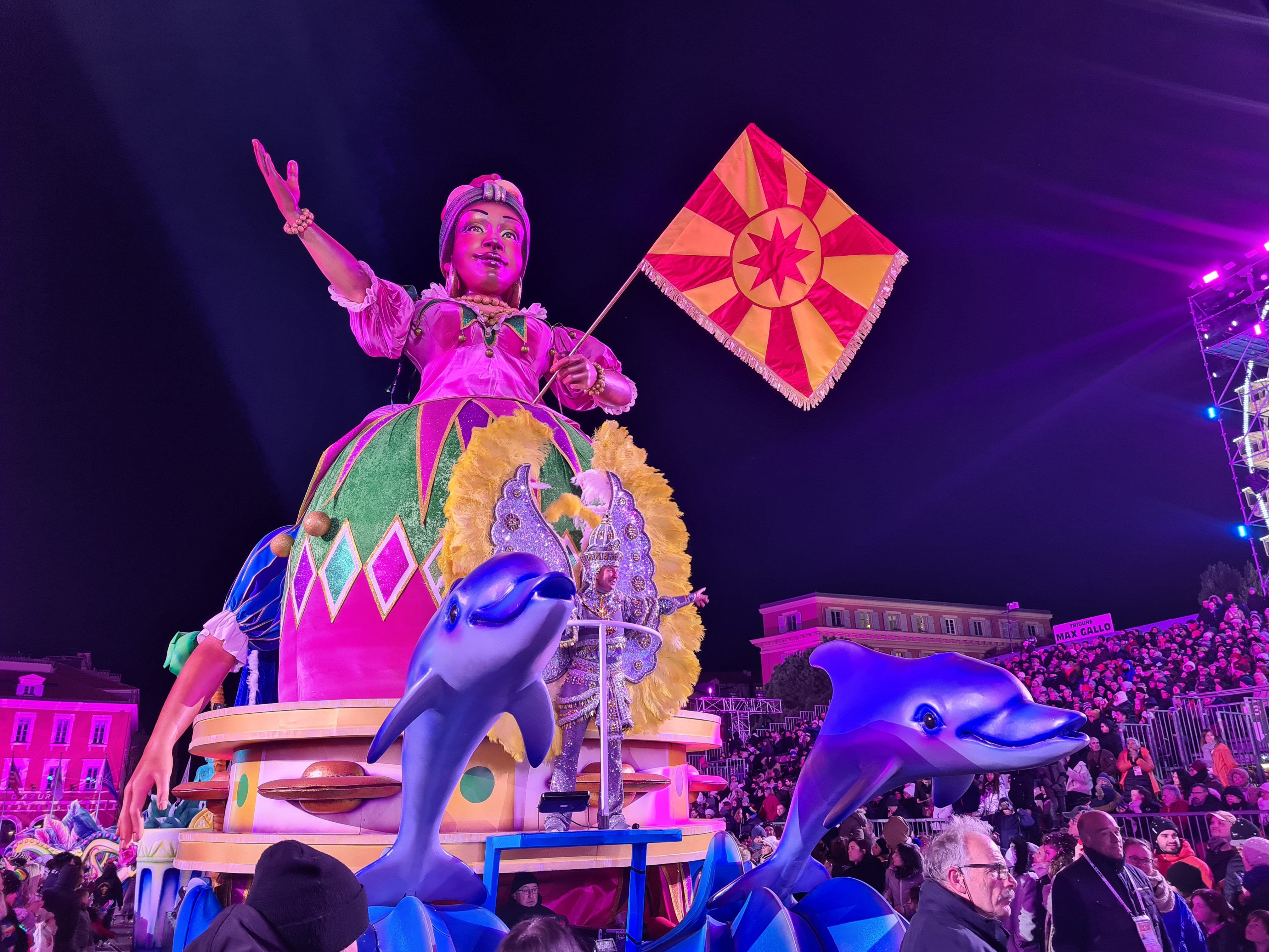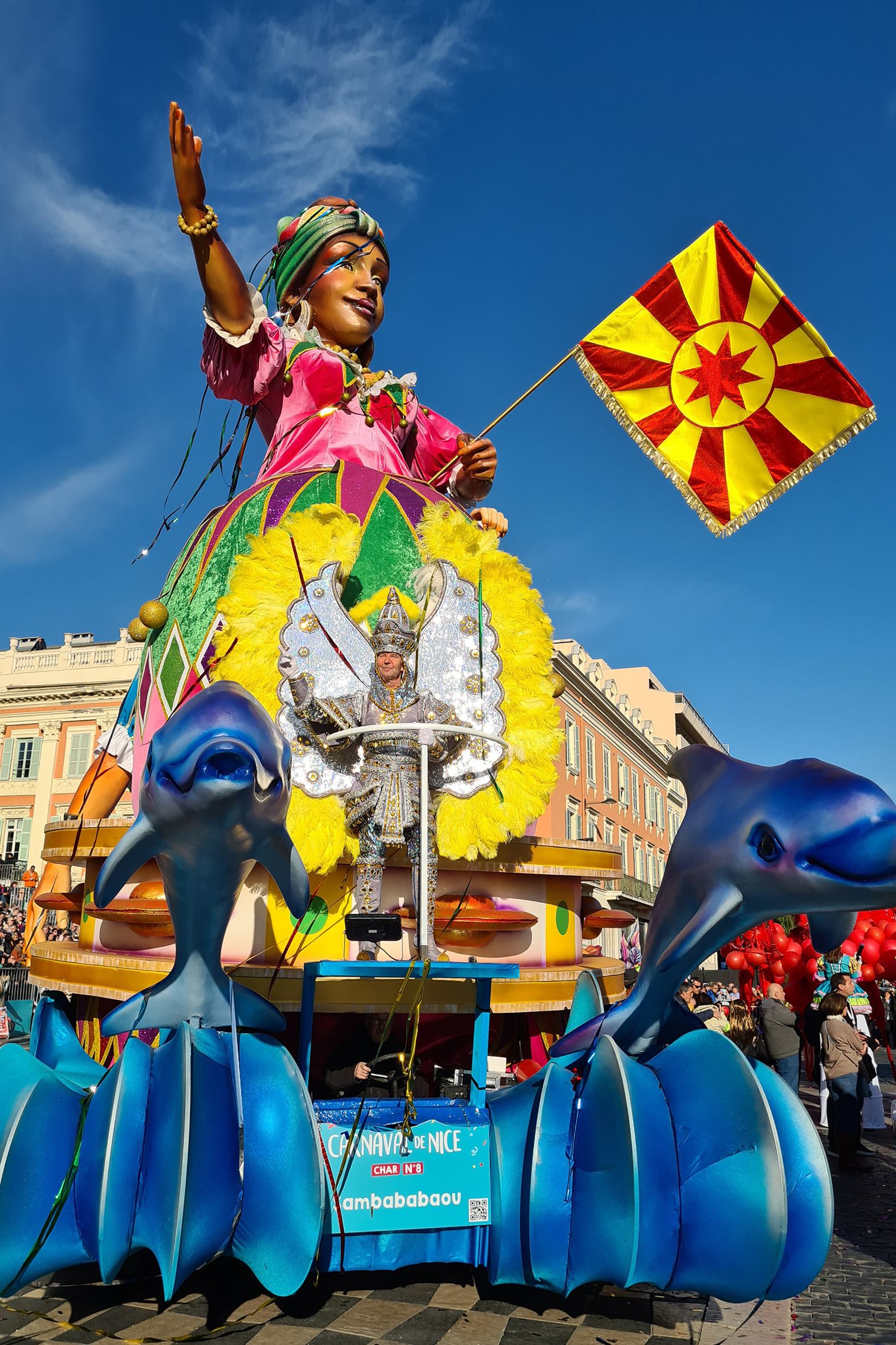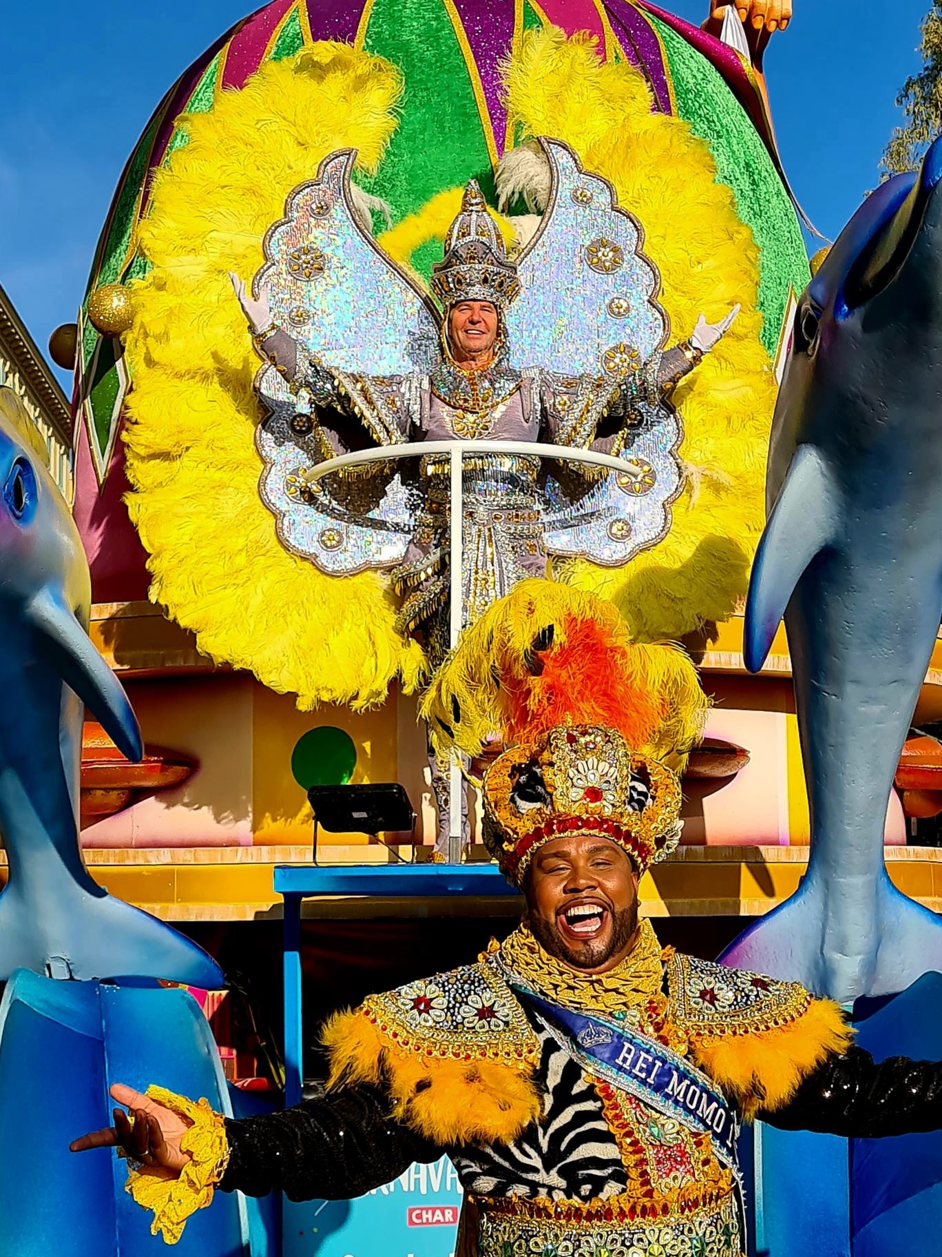 Thème : « Sambababaou »Commentaires : En hommage au carnaval de Rio, ce char représente les icônes du carnaval brésilien: la porte-drapeau et son maître de cérémonie.Costume : Véritable Destaque de Rio de Janeiro